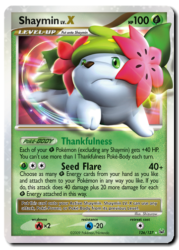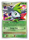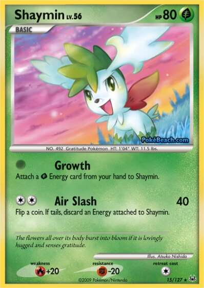 Foi revelado para o set TCG "Platinum" a carta de Shaymin na forma Celeste, ele é a carta #15/127 e está no Lv. 56. Há um texto na carta que diz o seguinte: "The flowers all over its body burst into bloom if it is lovingly hugged and senses gratitude", o que fala que o corpo de Shaymin foi amorosamente abraçado pelas flores e ele se sentiu grato por isto, possivelmente esta é a frase de entrada da Pokédex do Shaymin em Pokémon Platinum (versão americana).