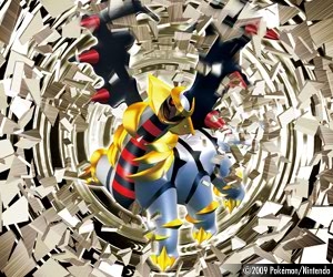 Monferno está bastante evidenciado na imagem e Staraptor se encontra logo à esquerda da cauda de Pachirisu. Além disso, existe a presença de dois novos personagens, sendo que um deles carrega uma curiosa esfera. Por fim, a palavra escrita na imagem, traduzindo para o português, é Giratina.